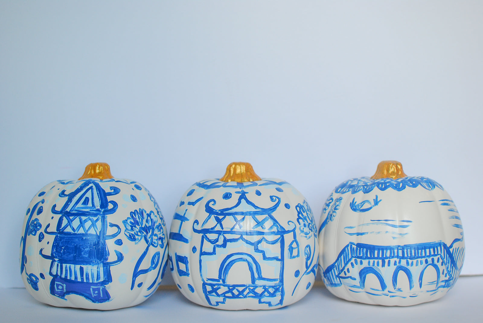 celebrate the season with one-of-a-kind, hand-painted pumpkins by Catherine Cochran. each piece is a miniature work of art — delicately detailed in timeless chinoiserie blues or playful mahjong motifs. designed to bring a touch of sophistication and whimsy to your fall décor.